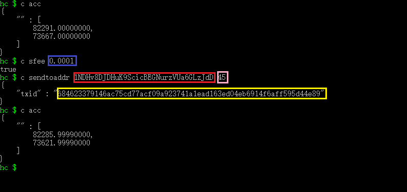 设定完交易费用,输入c sendtoaddr <接收方地址> <转账数量>,如下图所示红色框选部分为接收方地址,粉红色框选部分转账数量。