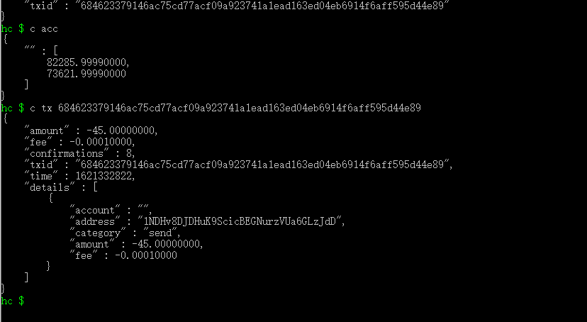 在程序终端hc$提示符输入命令“c acc”查询账户余额,余额减少符合预期即可确认。